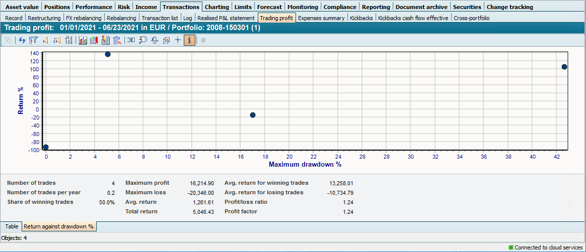 The chart belonging to the "Trading success" evaluation is a risk/return chart. In a cloud of points, it shows where the focus is on the risk/reward ratio.