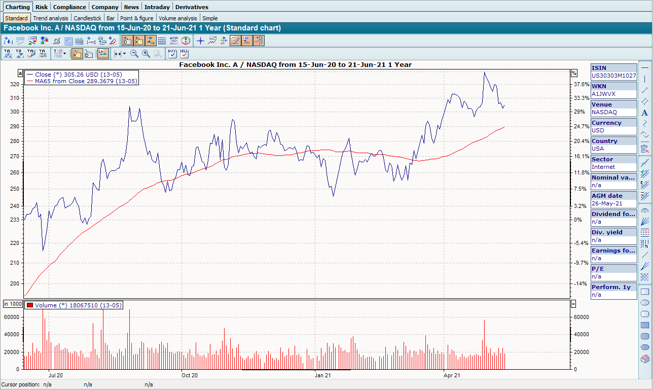 Your Infront Portfolio Manager offers you a wide range of options for designing charts. In addition to the various display formats (e.g. line, candlestick or point-and-figure charts), you can also show comparative values, over 70 indicators or draw your own trend lines or texts.