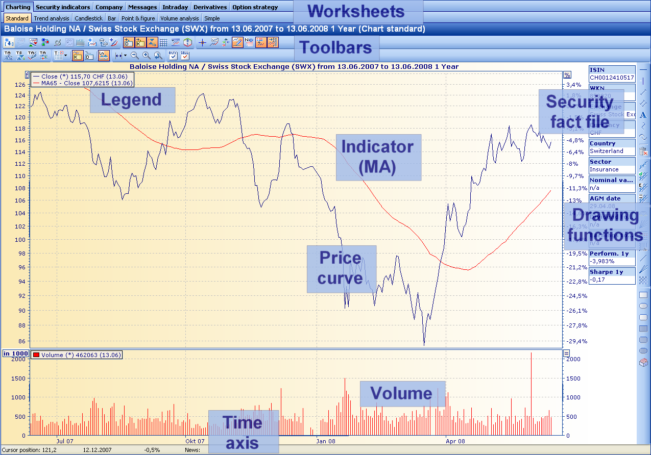The area in which the price trend is shown is called the chart. Turnover (as well as some indicators and trading systems) are shown in separate charts.
