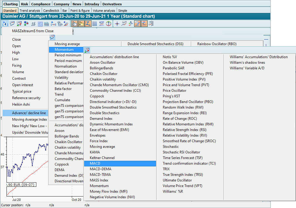 In the Infront Portfolio Manager, you can use the "Show new time series" and "Show base trading system" icons in the chart window to display predefined time series or base trading systems in a chart. You can use the "Show indicator" icon to apply predefined time series functions to time series that have already been shown. These formula splits are therefore placed after the formula of the selected time series when used in the chart, i.e. linked to the predecessor.