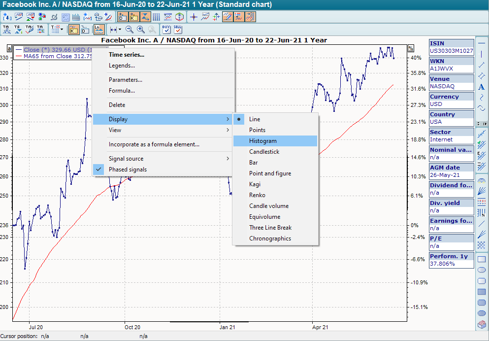 The quickest way to access other chart forms is from the context menu of the price history. To do this, select the time series in the legend and select the DARSTELLUNG command.