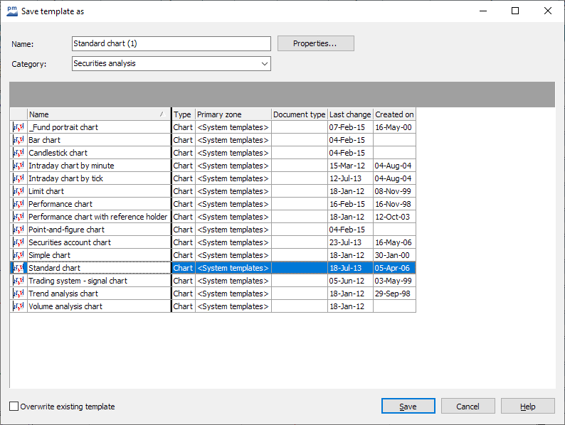 The templates for charts save numerous settings, from the background to the time period to the indicator settings. You can change an active chart template as required and then save the changes.