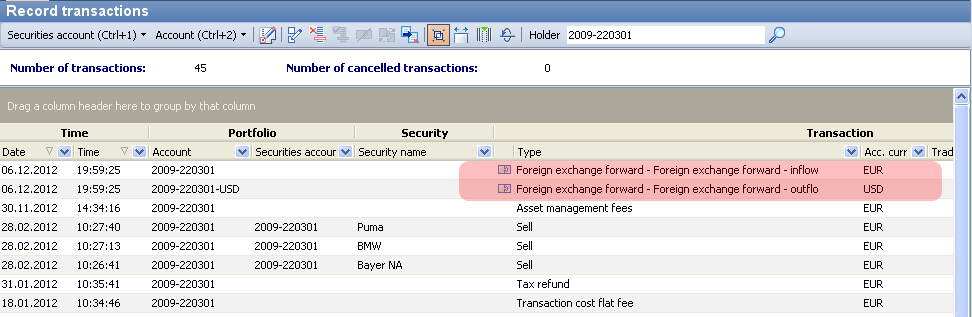 Combined transactions combine several individual transactions into a logical unit. These can be quickly recognized by an icon in the list of recorded transactions. Combined transactions arise, for example, when recording an exchange of securities in which the old security is delivered and the new security is received. The resulting transactions are (logically) linked to each other.