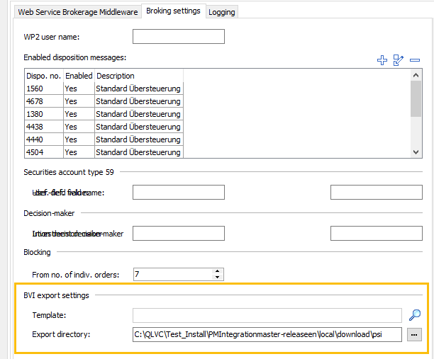 In the configuration of the respective dwp interface, define the desired settings for the template and export directory on the "Broking settings" tab in the "BVI export settings" area. Use the "BVI export" report as a template, for example.