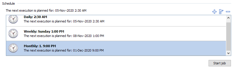 Proceed in the same way if you want to set additional start times for the same job. In theory, any number of schedules can be created for each job. The next execution is displayed for each schedule. The next execution for the job can be seen above in the "Schedule" area. Currently deactivated schedules are inactive (grayed out).