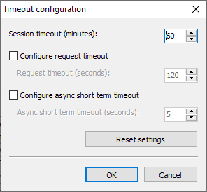 You can use the "Request timeout" to specify after how many seconds a call (remote procedure call) is considered to have been exceeded. To change the default value, activate the "Configure request timeout" checkbox and enter the value in the corresponding field.
