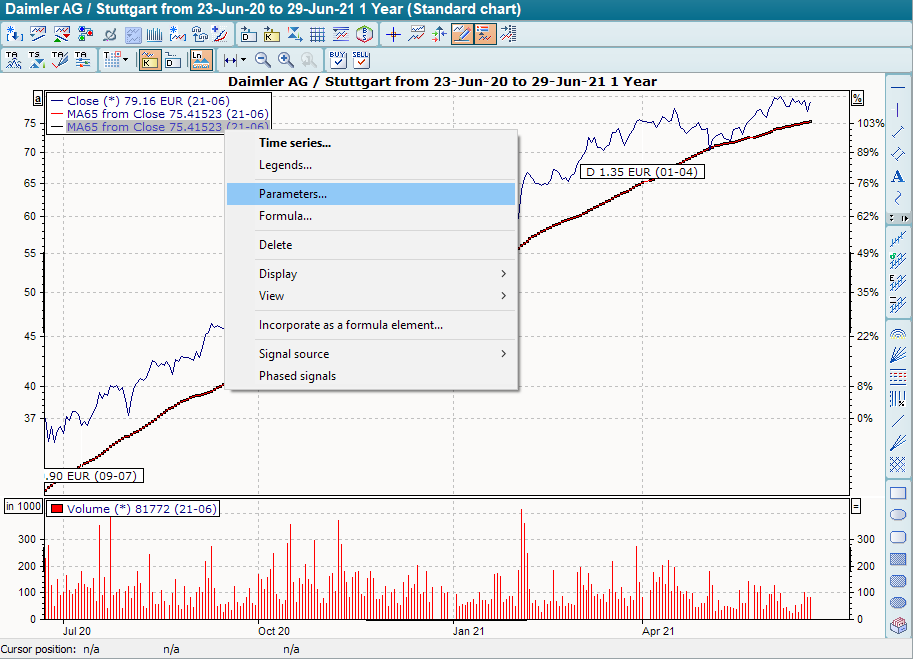 A copy of the GD is displayed in the chart and is already selected. - You can now use the context menu to change the parameter settings for this second GD to "200 days", for example.