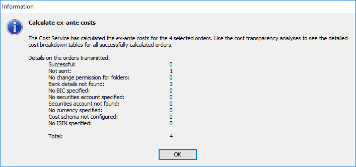 After the data exchange via the cost service for the ex-ante costs for orders of the respective investment firms, detailed messages appear. In addition to the number of orders, these also provide information about missing or incomplete bank details or unconfigured cost schemes, for example.
