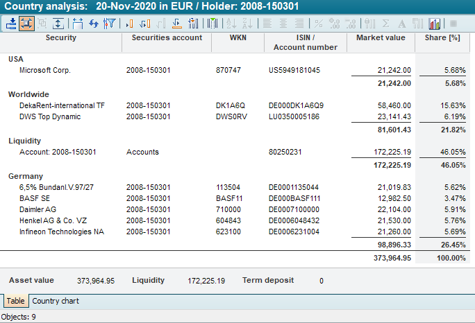 Country | The evaluation is grouped according to this column. In addition to the countries, liquidity (for accounts) and, if applicable, the special investments forward exchange transactions, loans and fixed-term deposits also appear here. The column contains country information on the individual securities corresponding to the "Country" field in the WP master data. This has the advantage that IBM shares purchased in euros, for example, are not allocated to Germany but to the USA. |