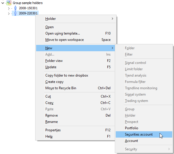 In order to create a securities account, at least one holder and at least one account must be created for this holder. You should therefore first read the sections Create owner and Create account.
