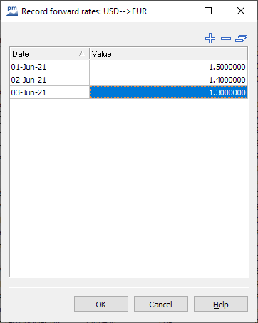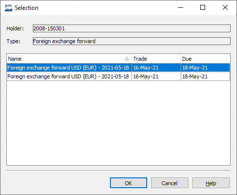 Then select the "Enter forward rates" icon. The "Selection" dialog box appears, in which all the holder's forward transactions are listed.