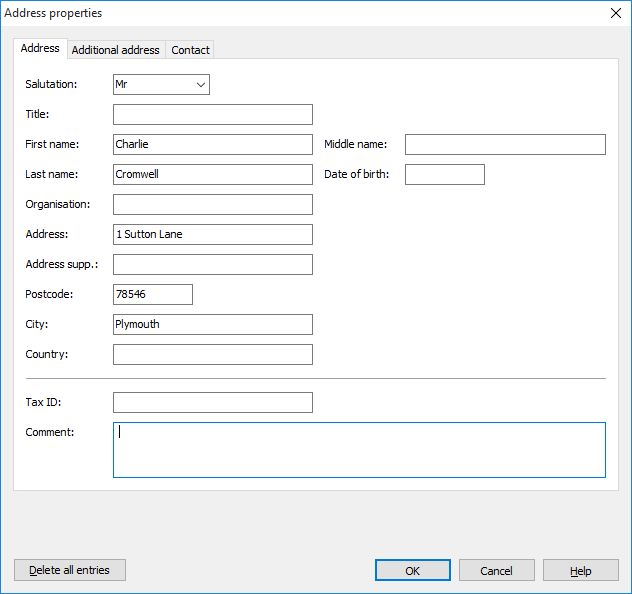 - In the "Address properties" dialog box that appears, enter the data in the "Address", "Additional address" and "Contact" tabs.
