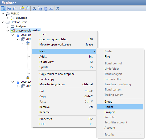 After creating a holder, you will be asked whether you would also like to automatically create a portfolio, an account and a custody account for this holder. If so, the portfolio with account and custody account is created below the holder. You can then enter all the relevant master data in the properties of the securities account objects. You can also make the exact portfolio configuration afterwards.