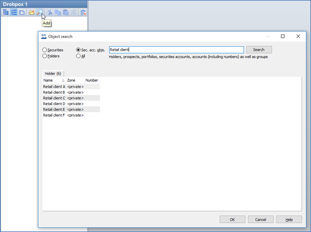 To add objects to the clipboard, click on the "Add" icon. The object search opens.