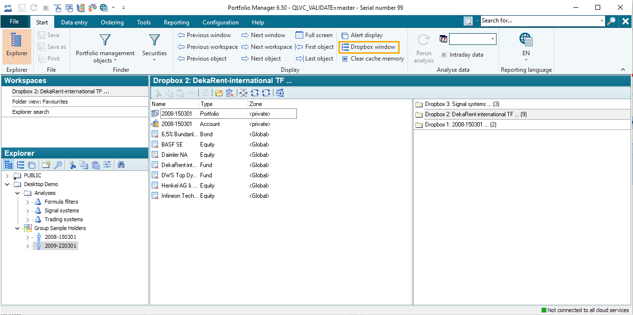 On the right-hand side of the filing window, all files that you have created in the current session and have not yet deleted are displayed. The selected file is opened in the middle window.