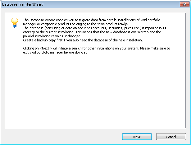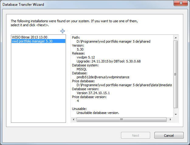 After clicking on "Next", the wizard searches your system for further installations. The installations found are listed in the database transfer wizard: