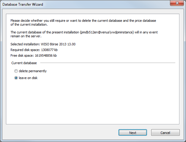 Select whether the currently existing database should be deleted or remain on the hard disk.