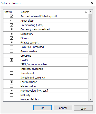 Specify here which fields (table columns) from the table analysis are to be saved together with the alert. To do this, activate the corresponding checkboxes for the data fields in the "Shown" column. Deactivate the data fields that are not required.