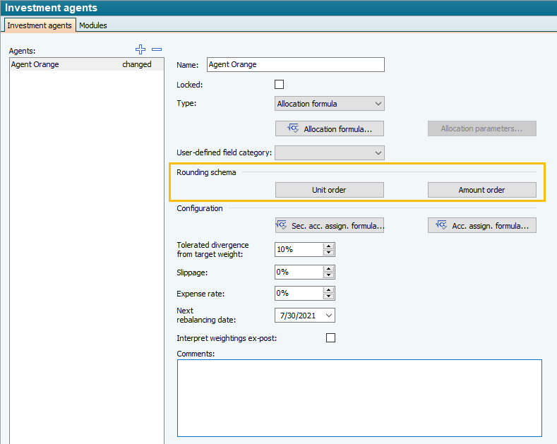 When configuring the investment agents, you can define rounding schemes for unit and amount orders in the "Rounding scheme" area using the "Unit order" and "Amount order" buttons.