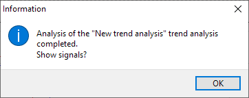 Message at End of evaluation | This checkbox is only available if you have opened the trend analysis properties via the PROPERTIES command in the context menu of the trend analysis folder in the Explorer (<F12>). If you activate this checkbox, information about the signals found will appear after the end of the evaluation. This is particularly useful if the trend analysis folder is evaluated automatically after data retrieval.