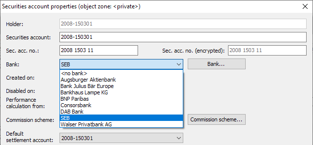 - In the "Depot properties" dialog box, select the desired entry from the "Bank" selection list.