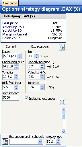 Select the "Option strategy calculator" icon on the "Tools" tab. Or select the "Option strategy calculator" icon on your quick access toolbar. In the chapter Quick access toolbar you can find out how to configure the quick access bar and thus have quick access to exactly the functions you need again and again. Or use the quick search to search for an underlying (e.g. the "DAX" index or a share on which options are traded) and then open its workspace by double-clicking on it in the search result. Then switch to the "Option strategy" worksheet in the workspace of the underlying and click on "Calculator". In this case, the selection of the underlying described in the following step is omitted and you are taken directly to the option strategy calculator with the preassigned underlying.