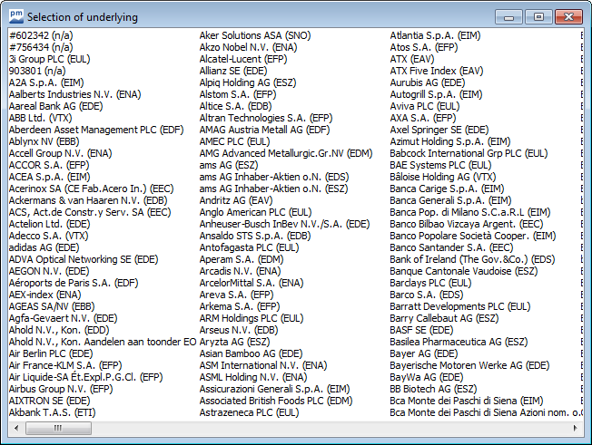 In the "Underlying selection" dialog box that appears, select the desired underlying by double-clicking on it. Tip: Enter the first letter of the underlying you are looking for to jump to the correct position in the list. The option strategy calculator opens with the underlying as the input object. The calculator form has an input area on the left and an output area on the right, which is still empty as long as no strategy is selected. Once the underlying has been defined, some key figures are shown at the top left: