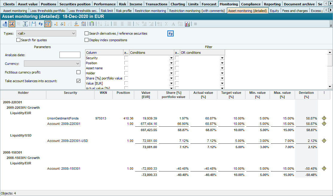 With this evaluation, your Infront Portfolio Manager provides you with a more detailed presentation of the asset monitoring data. You can find this evaluation in the workspace of groups, portfolios, holders or securities accounts on the "Monitoring" worksheet (in the delivery state).