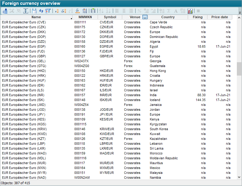 This evaluation can be opened via the FILE, OPEN TEMPLATE command in the ribbon, for example. If you have openedthe Finder Securities, you will find the "Foreign exchange overview" on the "Finder Other" worksheet in the delivery state.