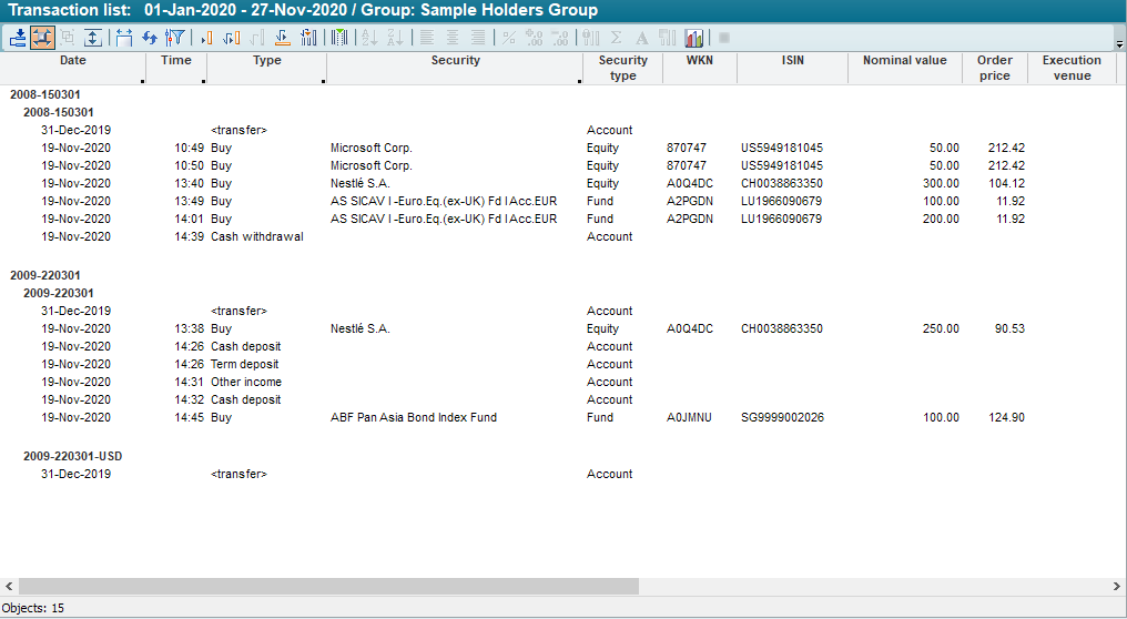 The "Transaction list" report lists all transactions of a holder (or portfolio). By default, this table is grouped by holders/portfolios and accounts.