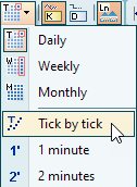 Finally, click on the "Consolidation" icon and select an intraday interval, e.g. "Tick by tick". The price data is neartime and available on a pull basis, i.e. new data must always be requested via the "Update and re-evaluate data" icon or the <F8> key.