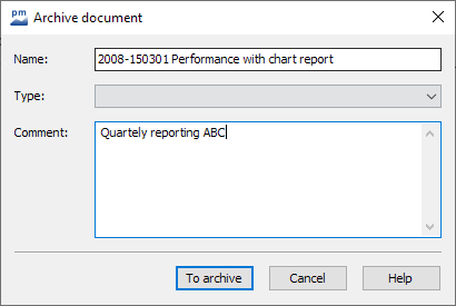 To archive the displayed "Performance report with graph" as a document, press the key combination<CTRL>+<ALT>+<M>or select the ARCHIVE command on the "Report" tab. The "Archive document" dialog box appears.