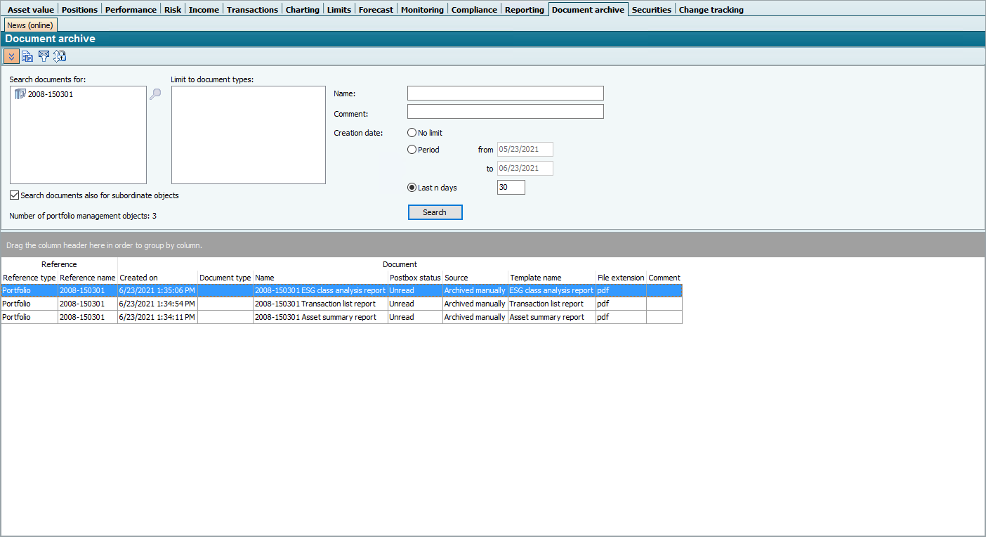 If the "Search documents also for subordinate securities account objects" checkbox is activated, you will see all documents that are archived for this securities account object and its subordinate securities account objects. For example, in the document archive of a portfolio you will also find the documents that have been archived for the securities accounts and accounts of this portfolio.