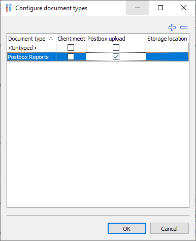 To add new document types, select the "Add document type" icon. Then enter the desired name for the new document type in the "Add document type" dialog box that appears and confirm your entry with "OK". The new entry then appears in the list. To remove document types from the list, highlight the entry and select the "Remove selected document type" icon.