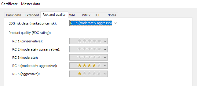 Below you can see the EDG ratings of the individual risk classes (product quality). You can also change these here via the respective selection list. In addition to the classification into 0 to 5 stars, the entry "n/a" is also available for certificates without a rating.