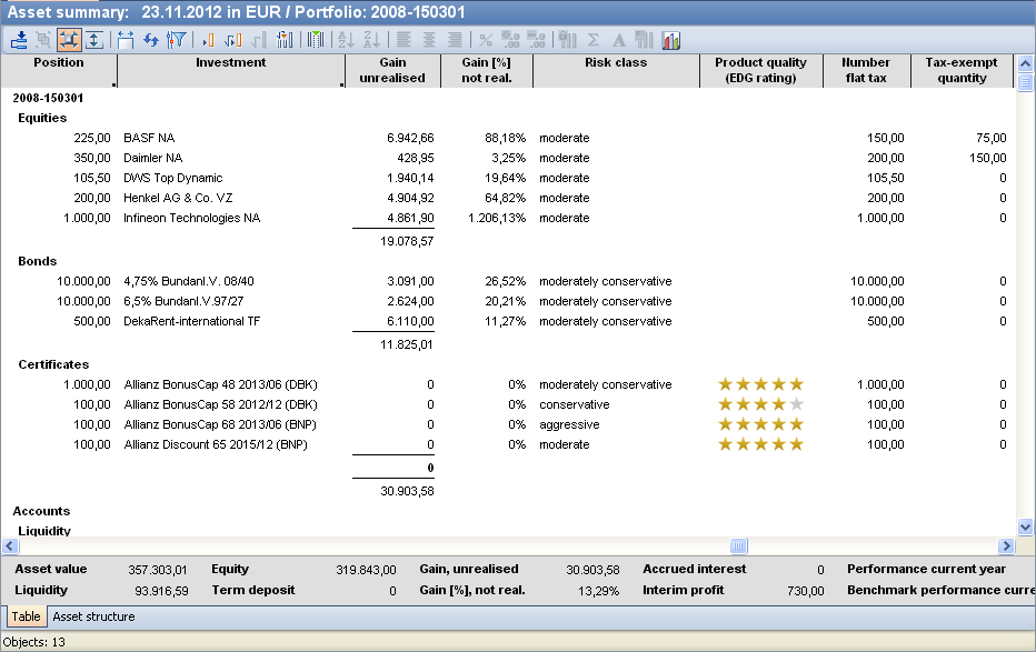 Risk class | (Top) risk class of the position. For securities, the EDG risk class assigned to the security in the master data is shown here. For all other positions, the corresponding risk class is preset for each type. You can also change this assignment via the user-defined "Risk classification" field. |