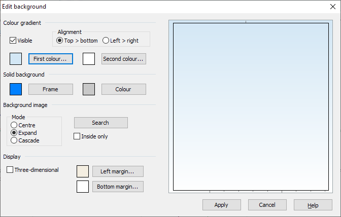 Background image | You can also define a graphic (bitmap) as the background image. Click on "Search" to select the desired graphic. You can center, expand or cascade graphics. You can also specify whether the graphic should only be inside the diagrams, in which case the legend is displayed in the normal background type (checkbox "Inside only"). |