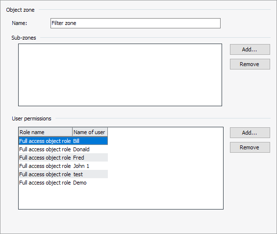 User authorizations | Take the user authorizations for this object zone from this table. Assign further users to this object zone using the "Add" button. The following "Role/user assignment" dialog box opens: In the dialog box that appears, you can select multiple users by holding down the <CTRL> key (or <SHIFT> if the entries are one below the other) during selection: Close the dialog box after selection with "OK". Then select the "Select role" button to assign a role to these users. Confirm the assignment in the "Role/user assignment" dialog box with "OK". Selected assignments can be deleted again using the "Remove" button. Multiple selection is also possible here. |