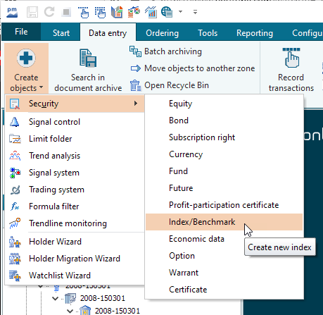First create the index as a new security. To do this, on the "Data maintenance" tab, select the command VALUE PAPER, INDEX/BENCHMARK in the menu of the "Create objects" icon. Please also read the section on securities.