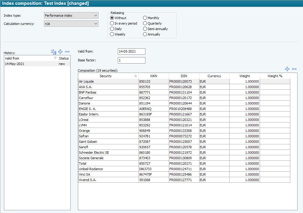 Repeat steps 7-9 for further (historicized) elements or versions of the index composition. Enter a separate "Valid from" date for each entry.