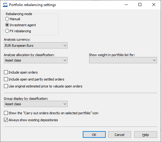 Basic configuration | Only in "Manual" mode for ad hoc reallocation or ordering. Select the desired basic configuration from the selection list. The basic configurations contain the parameters that were defined as part of the investment agent configuration and saved there as an investment agent of the type "Basic configuration". |