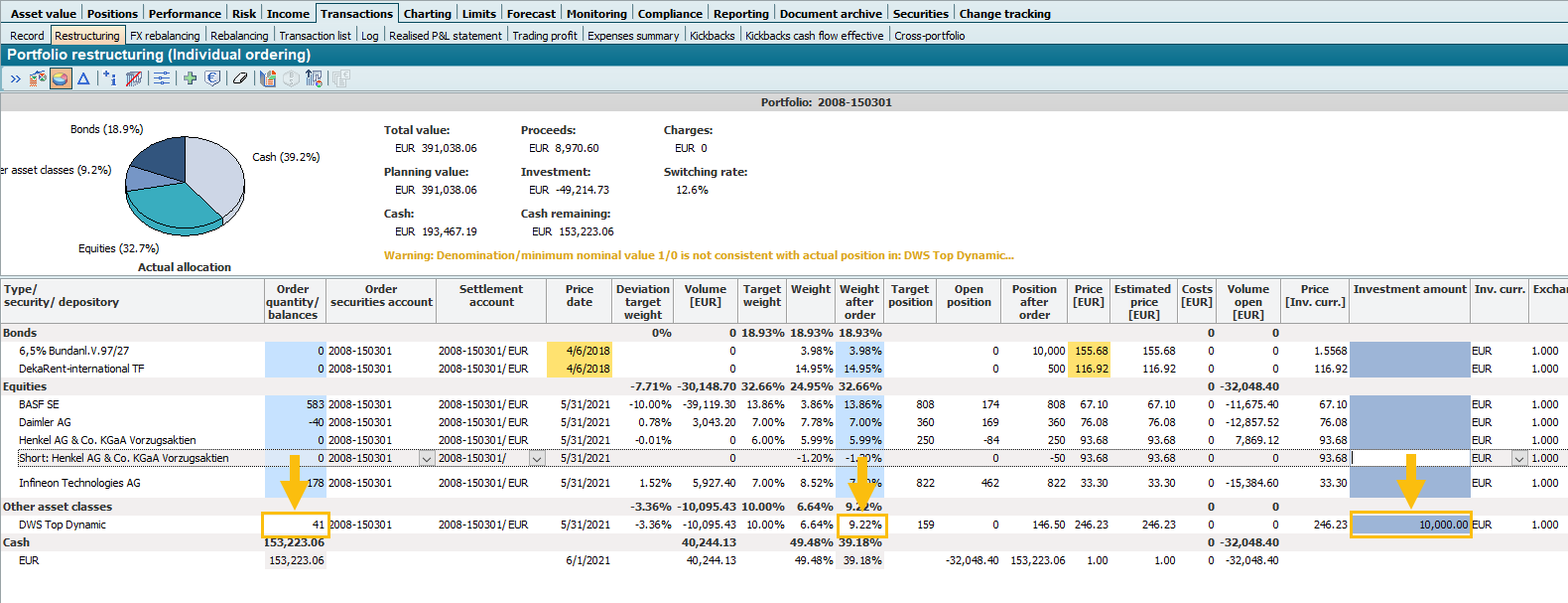The maximum possible number of units for this investment amount is calculated in the "Orders (planned)/balances" column, and the corresponding weight is calculated in the "Weight by order" column. The denomination of the fund from the master data is also taken into account. Manual entry in these columns does not make sense for amount orders and is therefore not possible.