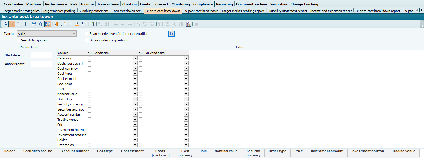 The "Ex-ante cost breakdown" provides you with a detailed overview of the ex-ante costs of your planned orders. Divided into entry costs, ongoing costs and exit costs, the individual current amounts from the cost service are shown for all of the holder's orders in the selected period. You can find the table, for example, on the "Compliance" worksheet in the open workspaces of depot objects.