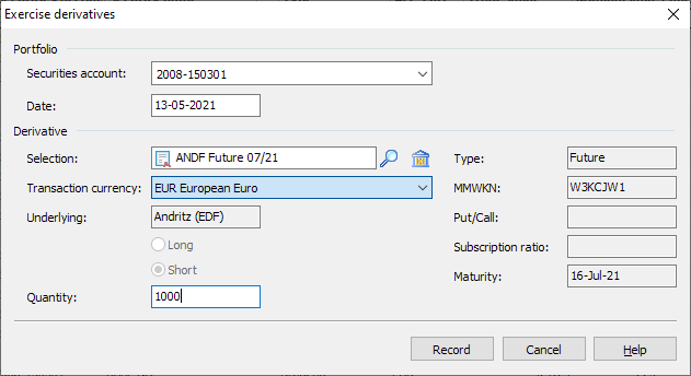 Select the transaction type DERIVATIVE EXERCISE from the securities account transaction types. Use the keyboard to enter the exercise of a derivative when the "Enter transactions" worksheet is open as follows: Press the key combination <CTRL>+<1> for the securities account transaction types. Then press the button<D>. The "Exercise derivatives" dialog box appears.