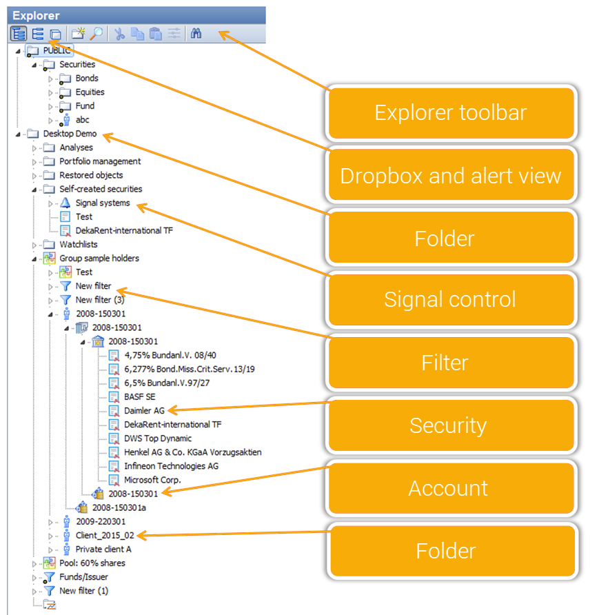 In the Explorer you will find securities account objects, folders, securities and all other visible elements. You can also create new owners, portfolios, accounts and securities accounts via the Explorer.