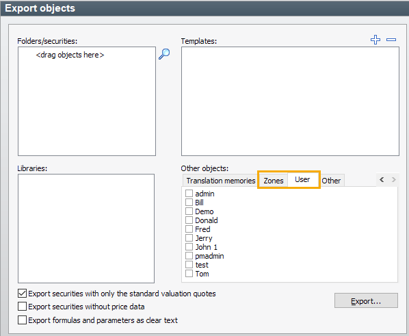 - In the "Export objects" worksheet that opens, you can specify the user management objects that you want to export. You will find these in the "Other objects" area on the new "Zones" and "Users" tabs, where you can select the zones and users to be exported individually.