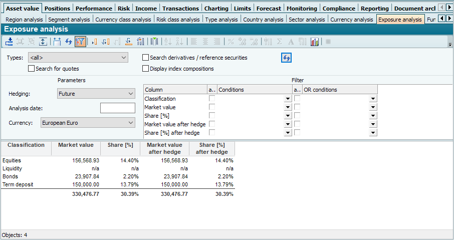 With the "Exposure analysis" evaluation, you can see at a glance the effects of your hedging strategies via futures or forward exchange transactions on the individual asset or currency classes.
