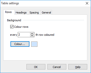 To change the row color, select the OPTIONS... command in the menu of the "General options" icon on the "Table" tab. The "Table settings" dialog box appears, in which you can edit various basic settings. Switch to the "Rows" tab with a mouse click.
