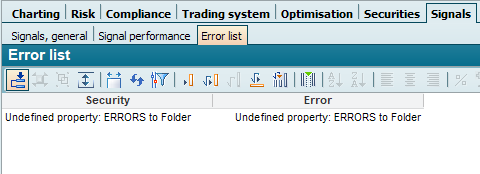 The "Error list" report lists all problems with the current evaluation of signals from signal and trading systems and formula filters in the "Security" and "Error" columns.