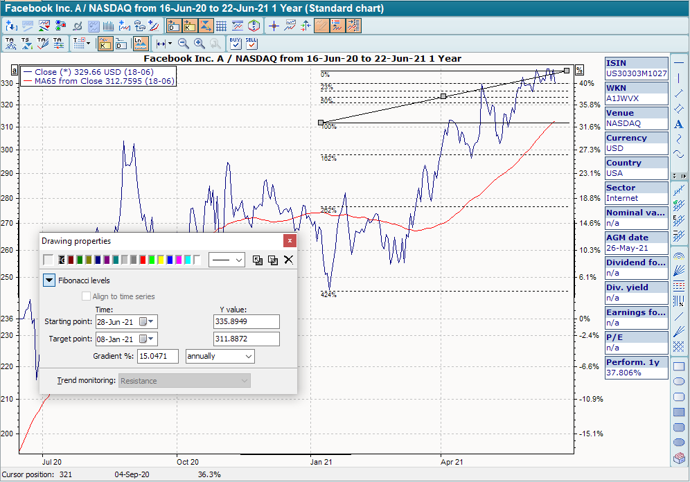 To draw the Fibonacci levels (Fibonacci retracements) in the chart, a trend line is first drawn between two extreme points in the price trend. Nine horizontal lines are then drawn that intersect the trend line at the Fibonacci levels of 0.0 %, 23.6 %, 38.2 %, 50.0 %, 61.8 %, 100 %, 161.8 %, 261.8 % and 423.6 %. (Some of these lines will not be visible in the chart window as they are outside the scaling)